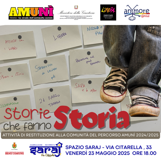 Nel 33° Anniversario delle strage di Capaci, si svolgerà “Storie che fanno Storia” un momento espressivo di restituzione alla comunità territoriale del progetto “Amunì Messina Le strade dell’antimafia sociale” promosso da USSM Messina, Libera ed Anymore Onlus.