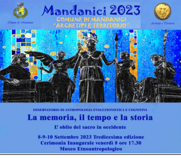 Torna con Relatori d’eccezione il Congresso Multidisciplinare “Mandanici 2023”, 13ª edizione,organizzato per l’8, 9 e 10 settembre dal neurologo Giuseppe Mento, presidente dell’Osservatorio“Archetipi e Territorio”, dal Comune di Mandanici e dall’Associazione “ilCentauro Onlus”e patrocinato dall’Università degli Studi di Messina, dall’Ordine Provinciale dei Medici Chirurghi e degli Odontoiatri di Messina e dall’ARPA in collaborazione col MuMe. Presenterà l’evento Silvana Paratore, legale esperto in politiche sociali. Mercoledì 6 settembre, ore 10, si terrà nella sede del Centro Diurno “Camelot” alla Cittadella Sanitariala conferenza stampa, coordinata da Silvana Paratore, in cuisi presenterà il ricco programma che vedrà la partecipazione di 50 studiosi di varie discipline umanistichee scientifiche e che si confronteranno su interessanti riflessioni che vanno dall’oblìo del sacro in bioetica ai miti e tradizioni della Sicilia nei racconti di viaggiatori stranieri, dalla sacralità delle forme mozartiane come sogno educazionale al cromatismo wagneriano, dal rapporto tra Pier Paolo Pasolini e il Sacro al mito di ER di Platone, dalla perdita del sacro nella società tecnologica all’uso politico della religione, dal risveglio della spiritualità sopita all’atteggiamento no vax, dalla sacralità del cibo all’intelligenza artificiale, dalla Neuroanatomia Cognitiva alla Cancel Culture, dal Wokismo al Mediterraneo frontiera di Pace.La Cerimonia Inaugurale si terrà venerdì 8 settembre, ore 17.30, al Museo Etnoantropologico di Mandanici dove si consegnerà il Premio “Raoul Di Perri 2023” per la Scienza, l’Arte e la Culturaed a cui seguirà la Lectio Magistralis “La memoria, il tempo e la storia”.La sera del 9 settembre si terrà lo spettacolo “Evocación” dell’artista Samuel Vaccaro. Chiusura lavori il pomeriggio del 10 settembre. Ingresso libero.