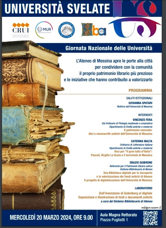 Mercoledì 20 marzo alle ore 9, in occasione della Giornata Nazionale delle Università, istituita su richiesta della CRUI, l’Ateneo di Messina apre le porte alla città per condividere con la comunità il proprio patrimonio librario più prezioso e le iniziative che hanno contribuito a valorizzarlo. “Università svelate” sarà il titolo che unirà idealmente gli eventi di tutti gli Atenei del Paese che si apprestano a celebrare questa ricorrenza con entusiasmo, affinché diventi un’occasione annuale di connessione tra istruzione superiore ed i rispettivi territori.Il programma prenderà il via a partire dalle ore 9, presso l’Aula Magna del Rettorato, con i saluti istituzionali della Rettrice, prof.ssa Giovanna Spatari. Seguiranno gli interventi del prof. Vincenzo Fera (già Ordinario di Filologia medievale e umanistica Dipartimento di Civiltà antiche e moderne), della prof.ssa Caterina Malta (Ordinaria di Letteratura italiana afferente al Dipartimento di Civiltà Antiche e Moderne) e del dott. Orazio Giubrone (Referente per il Patrimonio librario antico del Sistema Bibliotecario di Ateneo). Si svolgerà inoltre, a cura dello SBA UniMe, un laboratorio dal titolo “Dall’invenzione di Gutenberg al digitale Esposizione e illustrazione di testi e documenti antichi”.La Giornata Nazionale delle Università coinciderà con la Giornata Internazionale della Felicità, all’interno della Settimana della Minerva in un periodo dedicato alla celebrazione del sapere e dell’istruzione. “Università Svelate” ha ottenuto il patrocinio del MUR.