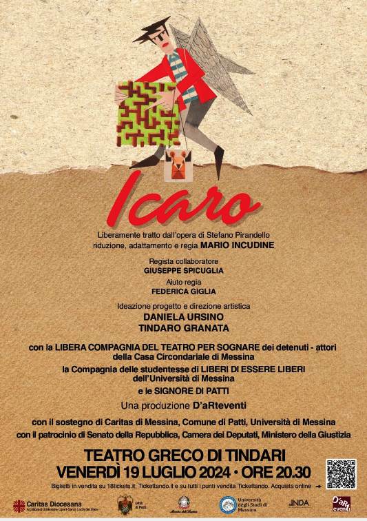 “Icaro” (produzione di D’aRteventi) ha il patrocinio della Presidenza del Consiglio dei Ministri, del Senato della Repubblica, della Camera dei Deputati, del Ministero della Giustizia , della Presidenza della Regione Sicilia ed è realizzata con il sostegno della Caritas di Messina, dell’Università di Messina e il Comune di Patti, dell’Assemblea Regionale Siciliana e di Fondazione Inda – Istituto Nazionale del Dramma Antico, per il prestito dei costumi di scena.