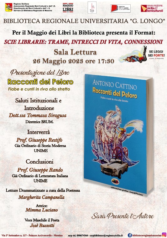 Venerdi 26 maggio , alle ore 17,30 presso il Nostro Salone Eventi , sarà presentato il libro “Racconti del Peloro. Fiabe e cunti in Riva dello Stretto” di Antonio Cattino- arricchito dalle Notazioni finali del Prof. Giuseppe Rando, nonché dalle recensioni critiche della Nostra Direttrice Dott.ssa Tommasa Siragusa, del Glottologo Enrico Caltagirone e dell’Operatrice Culturale Raffaella Spadaro- pubblicato nel mese di aprile 2023 per i tipi “Fogghi mavvagnoti”, inserito al n. 2 della collana editoriale “Nuovi racconti”, con il prezioso contributo della curatrice Dott.ssa Margherita Campanella.