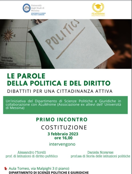 L’Associazione degli ex Allievi dell’Università di Messina, ha organizzato in collaborazione con il Dipartimento di Scienze Politiche e Giuridiche della stessa Università per promuovere una riflessione corale sulle parole e sui concetti della politica e del diritto. L’iniziativa, curata dal prof. Alessandro Morelli, ordinario di Istituzioni di Diritto Pubblico, vedrà avvicendarsi varie personalità del mondo accademico, politico e delle professioni che introdurranno il tema e stimoleranno il dibattito sulla parola oggetto dell’incontro.