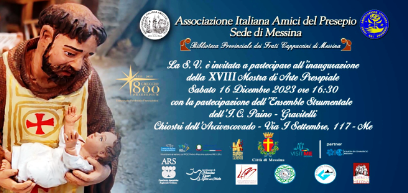 Presenti il sindaco Federico Basile, l’assessore alle Politiche Culturali Enzo Caruso, l’arcivescovo Mons. Giovanni Accolla, il deputato all’ARS Alessandro De Leo e il dirigente dell’Ufficio Scolastico Provinciale Stello Vadalà, domani, sabato 16 dicembre, alle ore 17, si svolgerà presso la cappella Santa Maria all’Arcivescovado l’inaugurazione della XVIII edizione della Mostra di Arte Presepiale “Sulle orme di Francesco”, organizzata dall’associazione italiana Amici del Presepio sede di Messina, in occasione degli 800 anni dal primo presepe (Greccio 1223 – 2023). La rassegna, grazie all’intervento del Comune di Messina, è realizzata in collaborazione con la Curia Arcivescovile, l’Ente Teatro di Messina e il contributo della presidenza dell’Assemblea Regionale Siciliana. Allieteranno la serata l’ensemble strumentale degli alunni dell’Istituto comprensivo Paino-Gravitelli.