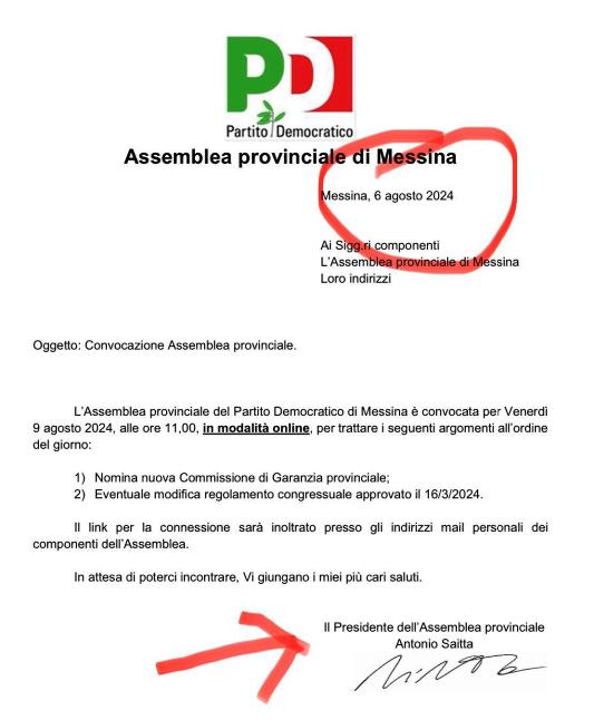 Niente di più falso perche’ oltre ad essere intervenuto su diversi organi di informazione e tv locali in merito alla costruzione del Ponte sullo Stretto, il 6 agosto ( allego foto della nota di convocazione ) ha convocato l’assemblea provinciale del partito Democratico firmandosi come presidente dell’assemblea provinciale del partito Democratico.