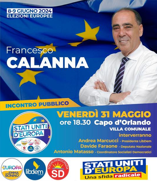 Venerdì 31 maggio, alle 18,30 presso la Villa comunale Europa di Capo d’Orlando, davanti al Municipio, si terrà un incontro pubblico con l’On. Francesco Calanna, candidato al Parlamento europeo nella lista “Stati Uniti d’Europa”. Interverranno il Sen. Andrea Marcucci, presidente dei liberali di LibDem, l’On. Davide Faraone, deputato nazionale di Italia Viva, ed il Prof. Antonio Matasso, segretario regionale dei Socialdemocratici. Francesco Calanna, attuale presidente del Gal Nebrodi Plus e già deputato regionale, è l’unico candidato messinese della lista promossa da Più Europa e Italia Viva, insieme a socialisti e socialdemocratici, radicali, liberali e centristi. Durante l’incontro, Antonio Matasso ricorderà Eugenio Colorni, partigiano socialista democratico ucciso ottant’anni fa dai fascisti: egli partecipò alla stesura del noto Manifesto di Ventotene, documento fondante del processo d’integrazione europa, a cui si ispira la lista “Stati Uniti d’Europa” e la stessa candidatura di Francesco Calanna. L’ex parlamentare dell’Ars è sostenuto, oltre che da LibDem e Socialdemocratici, anche da Più Europa.