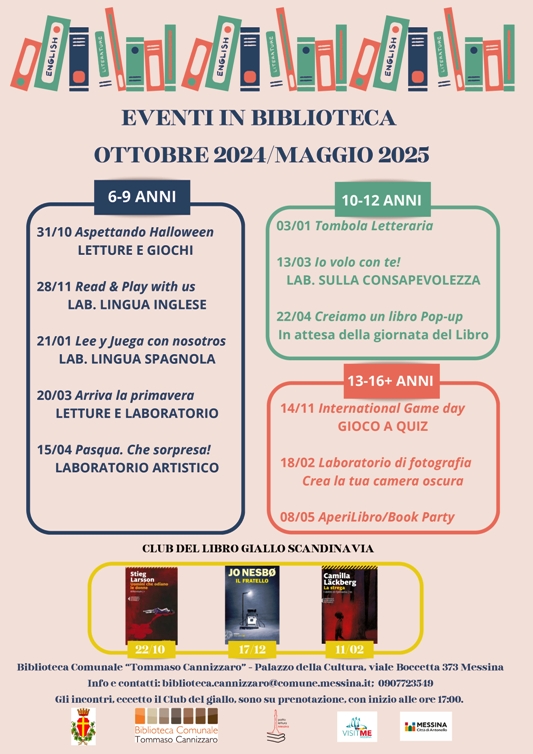 Gli eventi in Biblioteca sono previsti dal 31 ottobre 2024 sino all’8 maggio 2025, con il seguente calendario, per fasce d’età: da 6 a 9 anni – 31/10 Aspettando Halloween, letture e giochi; 28/11 Read & Play with us, Lab. lingua inglese; 21/01 Lee y juega con nosotros, Lab. lingua spagnola; 20/03 Arriva la primavera, Letture e laboratorio; 15/04 Pasqua. Che sorpresa!, Laboratorio artistico; da 10 a 12 anni – 03/01 Tombola letteraria; 13/03 Io volo con te!, Lab. sulla consapevolezza; 22/04 Creiamo un libro Pop-up, in attesa della giornata del libro; da 13 a 16+ anni – 14/11 International Game day, Gioco a quiz; 18/02 Laboratorio di fotografia, Crea la tua camera oscura; 08/05 AperiLibro/Book Party.