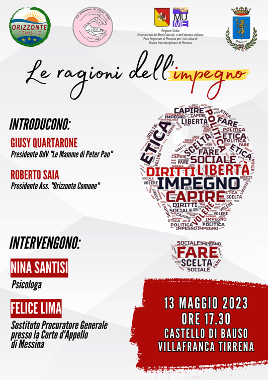 Villafranca Tirrena, 03 MAG. – Il 13 Maggio prossimo, alle ore 17.30, si terrà, presso il Castello di Bauso a Villafranca Tirrena, un convegno dal titolo “Le ragioni dell’impegno”, organizzato dall’Associazione Orizzonte Comune e l’OdV “Le mamme di Peter Pan”. Relatori saranno la psicologa messinese Nina Santisi, già assessore alle politiche sociali del Comune di Messina, e il Sostituto Procuratore Generale presso la Corte d’Appello di Messina, Felice Lima.