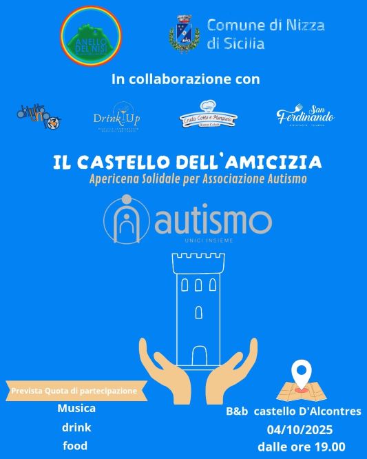 NIZZA DI SICILIA (MESSINA), 1 OTT – ‘Il Castello dell’Amicizia’: una serata tra musica e buon cibo per sostenere le attività dei laboratori di inclusione socio lavorativi del Centro per l’Autismo di Nizza di Sicilia. L’evento si svolgerà sabato 4 ottobre, dalle ore 19, nella storica e suggestiva e dimora del Castello d’Alcontres, organizzato dal Comune di Nizza di Sicilia insieme all’associazione Anello del Nisi. Il percorso gastronomico è firmato dalle cucine del ristorante ‘San Ferdinando’, da ‘Crudo, Cotto e Mangiato’ Coledi bistrot, e il supporto di ‘Di tutto un po’’ e ‘Drink up’.