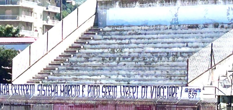 Peccato che i tifosi giallorossi non possono sostenere la propria squadra perché la presenza è stata vietata dalla Questura. Un derby metropolitano con un ulteriore handicap. Sugli spalti vuoti appare uno striscione(foto) che civilmente reclama il diritto di seguire la compagine in trasferta. Le forti motivazioni della premessa si trasferiscono in campo sin dall’inizio con le due squadre che alzano il ritmo della partita e tentano di affondare i colpi nella difesa avversaria.