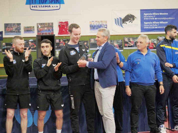 Si è giocato davanti ad una splendida cornice di pubblico, con la squadra allenata da Wang Hong Liang, coadiuvato in panchina da Marcello Puglisi, sostenuta da un tifo incessante. Prima di cominciare il presidente Giorgio Quartuccio, a nome della società, ha consegnato tra gli applausi una targa ricordo (“Fino all’ultimo punto, fino all’ultimo set, fino alla vittoria. Grazie Marco per un sogno durato sei anni”) a Marco Rech Daldosso, alla sua ultima apparizione della carriera, per premiarlo dopo sei fantastiche stagioni trascorse con la maglia della Top Spin, ricche di trofei e grandi soddisfazioni. Inevitabile un pizzico di commozione nel salutare ufficialmente uno dei protagonisti di annate indimenticabili, pronto ad intraprendere un nuovo percorso.