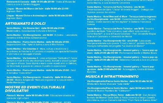 Attualità L’XI Edizione della Notte della Cultura a Santa Marina Salina: Un Viaggio tra Tradizione, Arte e Spettacolo Questa iniziativa gratuita nasce con l'obiettivo di offrire ai turisti un'immersione nell'anima dell'isola Redazione20 Agosto 2025