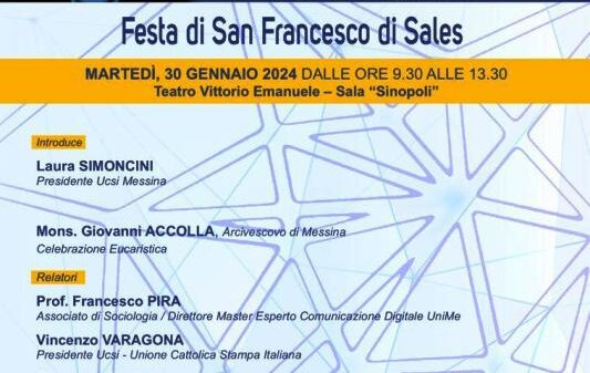 Cultura Il 30 gennaio nella Sala Sinopoli deli’ Ente Teatro Vittorio Emanuele,la Festa di San Francesco ii Sales, patrono dei giornalisti Occasione di incontro e di riflessione tra la Chiesa locale e i giornalisti ed operatori della comunicazione Redazione28 Gennaio 2024