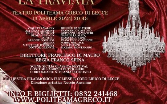 Cultura Sabato 13 aprile, la Traviata al Teatro Politeama Greco di Lecce, nell’allestimento del Sicilia Classica Festival Con la direzione artistica di Nuccio Anselmo e con la regia del giovane Franco Spina Redazione12 Aprile 2024