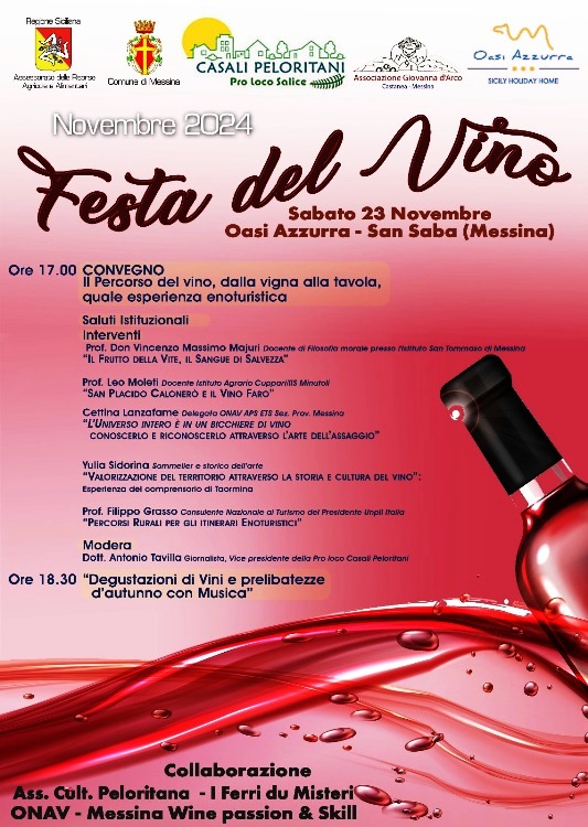 La Pro Loco Casali Peloritani, con il patrocinio della Regione Sicilia dell’Assessorato delle Risorse Agricole e Alimentari e del Comune di Messina, e in collaborazione con l’Associazione Giovanna d’Arco e l’Oasi Azzurra, invita tutti a partecipare al secondo appuntamento della Festa del Vino sabato 23 novembre alle ore 17:00.